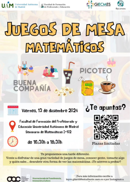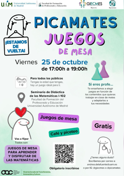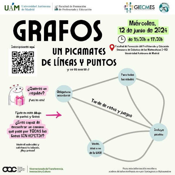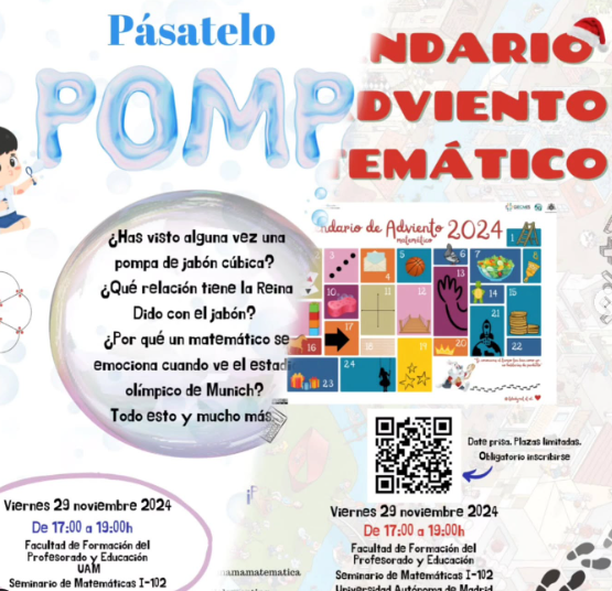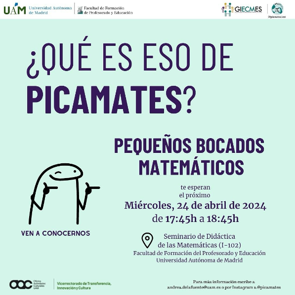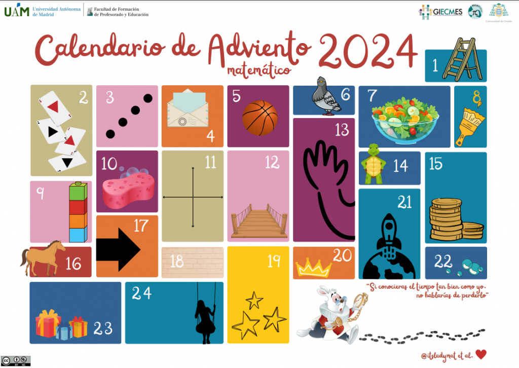 Calendario de adviento: Una de las iniciativas para seguir acercando las matemáticas a todo el mundo que proponemos desde el grupo de investigación GIECMES de la UAM y el proyecto #picamates. Este año, este calendario se ha realizado con la colaboración de los compañeros y compañeras del Departamento de Estadística, I.O y Didáctica de la Matemática de la Universidad de Oviedo. El calendario se puede encontrar en el repositorio de nuestra facultad. Lleva más de 5000 descargas. ¡Está siendo todo un éxito!